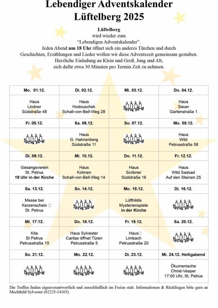 Der Zeitplan für den „Lebendigen Adventskalender“ in Lüftelberg steht. Herzlichen Dank an alle, die ihren Teil zu diesem Stück gelebter Tradition und vorweihnachtlicher Besinnung beitragen.